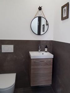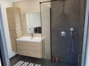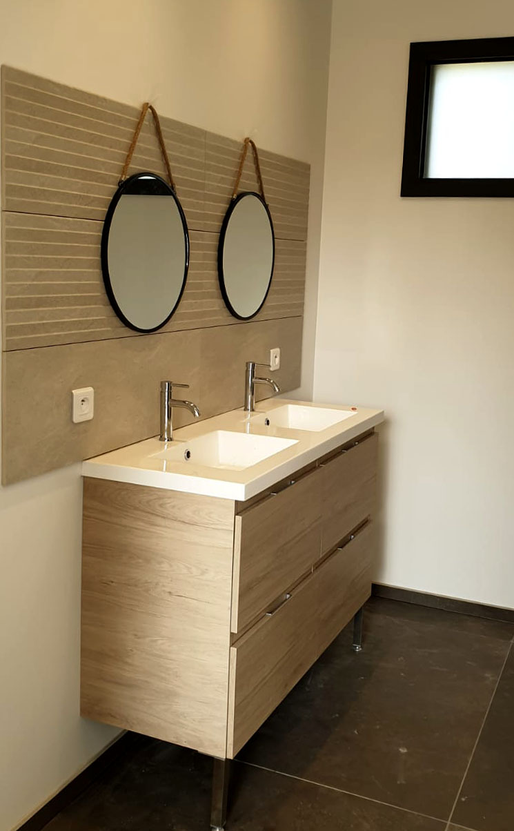 Une salle d’eau composée d’un lavabo à double vasque avec miroirs indépendants ainsi qu’une douche à l’italienne