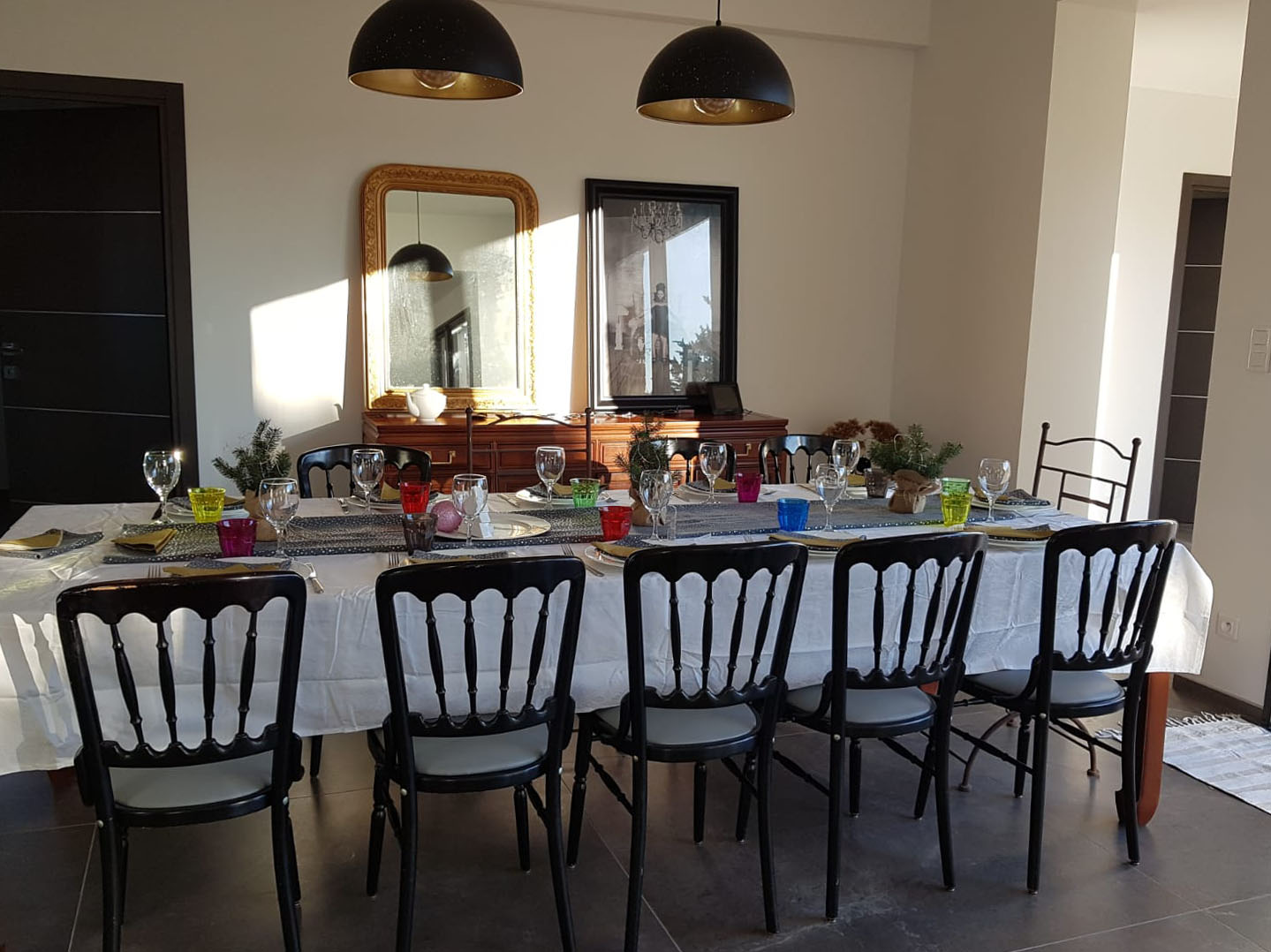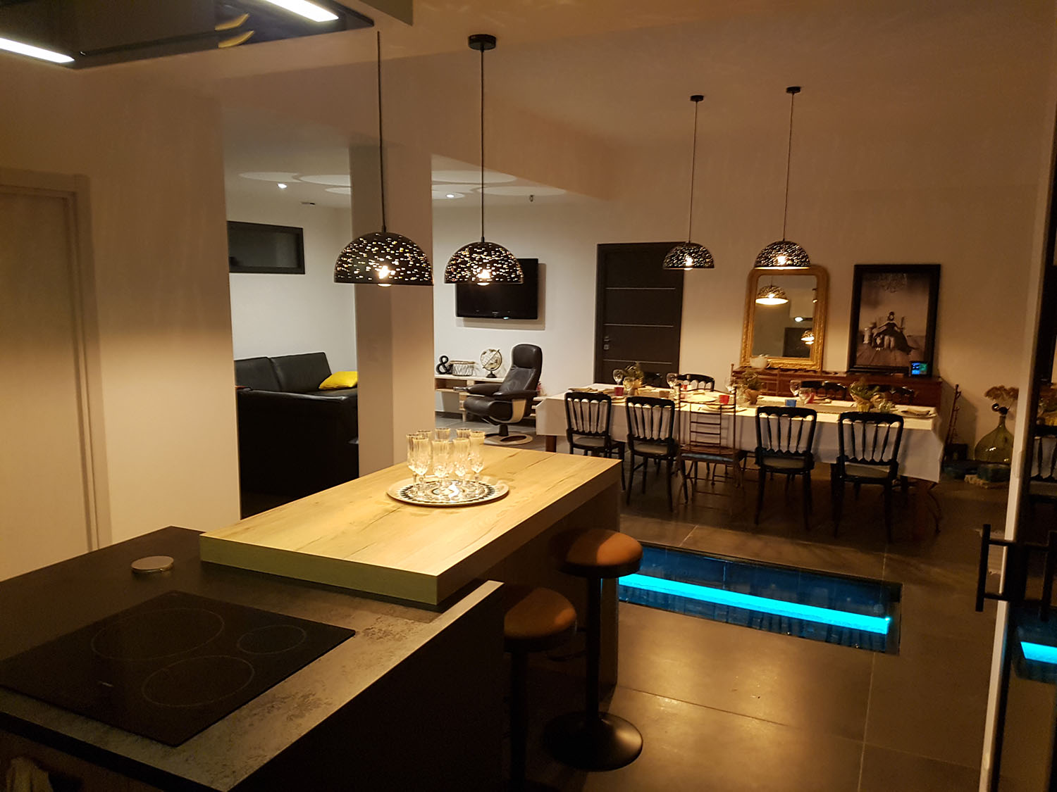 Cuisine équipée donnant sur une grande pièce à vivre. avec plaque induction, four, micro-Ondes, frigo américain, lave-Vaisselle, Nespresso, cafetière et bouilloire.