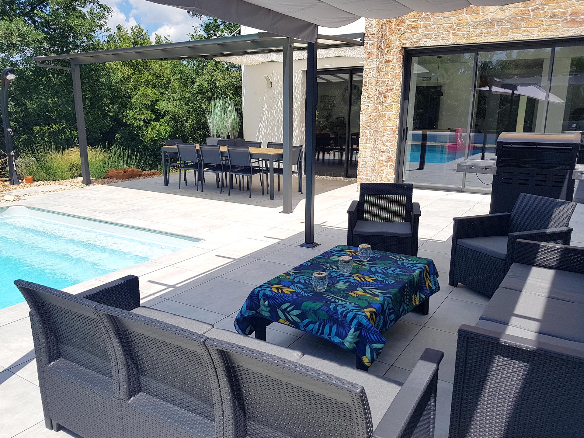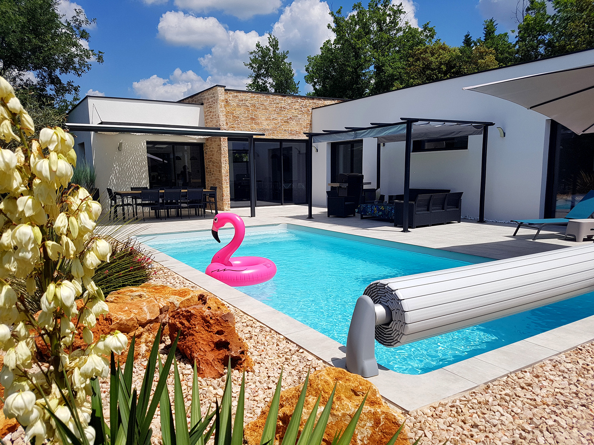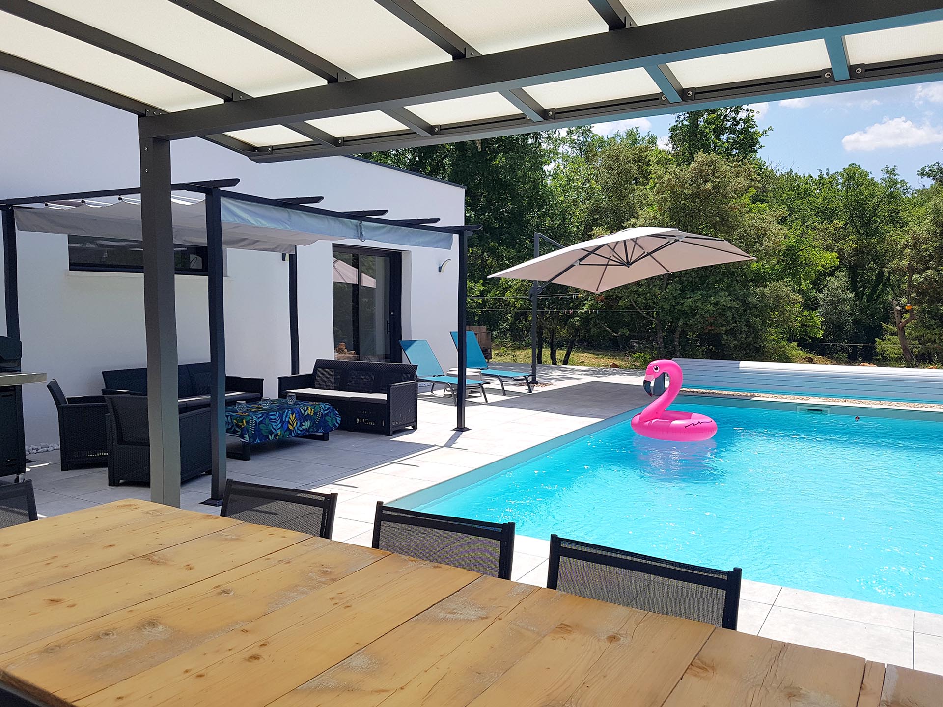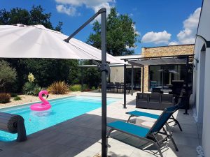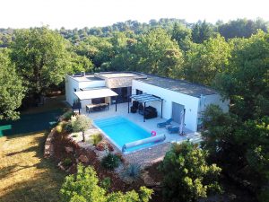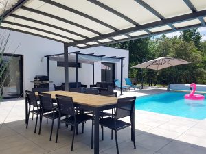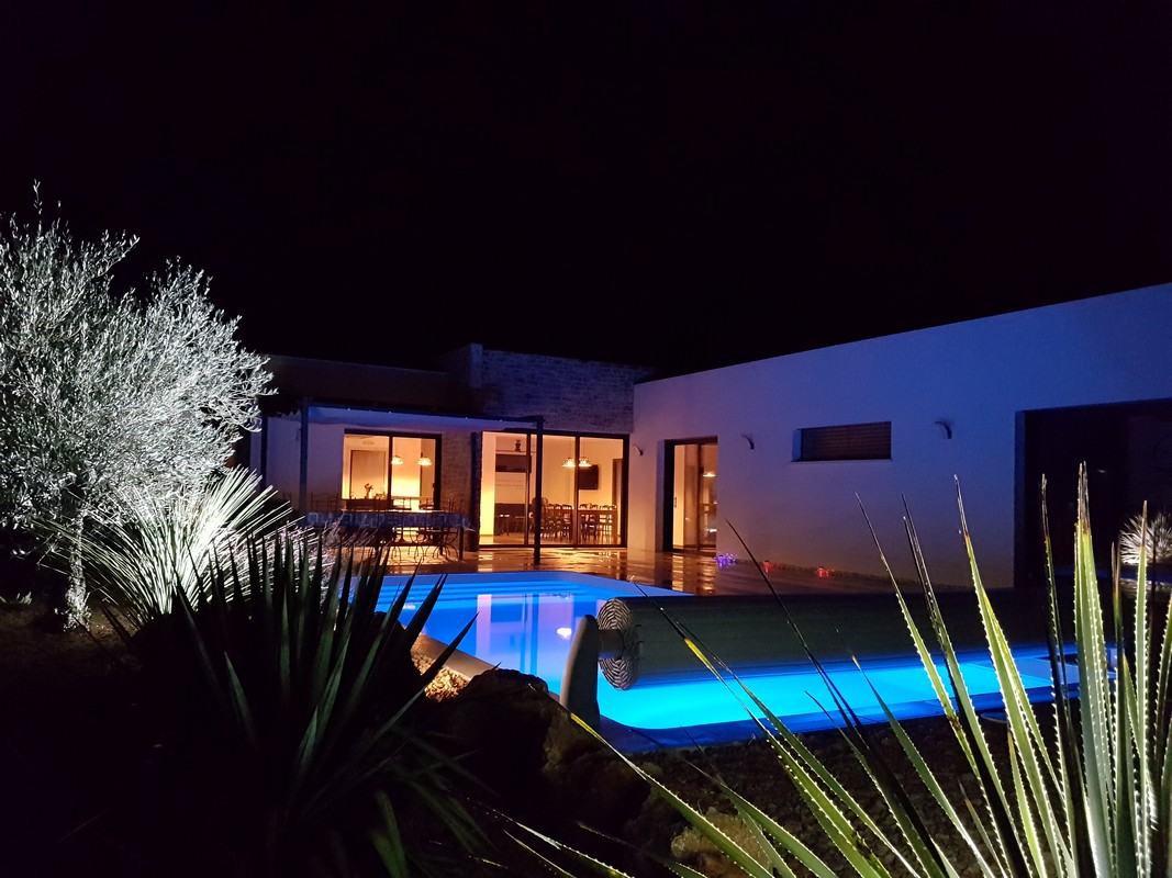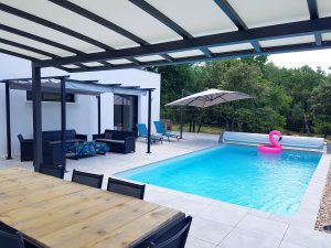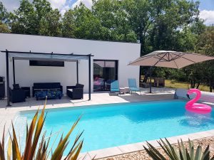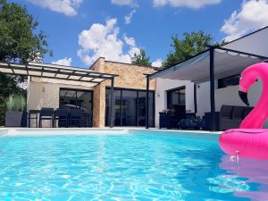 Villa de 140 m2 avec piscine au sel de 8 m x 4 m chauffée en haute saison. La maison est équipée d’un Hotspot Wifi.